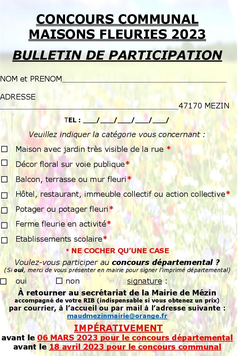 Le bulletin de participation est à retirer à l’accueil de la mairie ou nous pouvons vous l’envoyer après simple demande téléphonique (au 05.53.65.70.01).