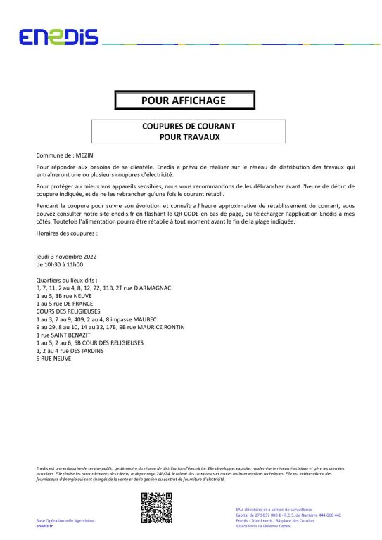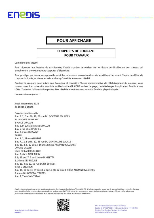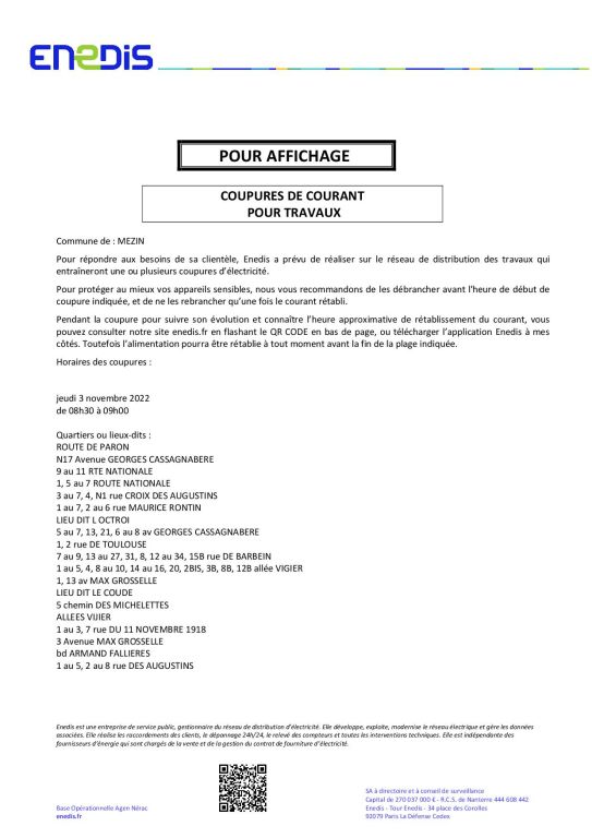 ENEDIS - coupures de courant pour travaux - Novembre 2022