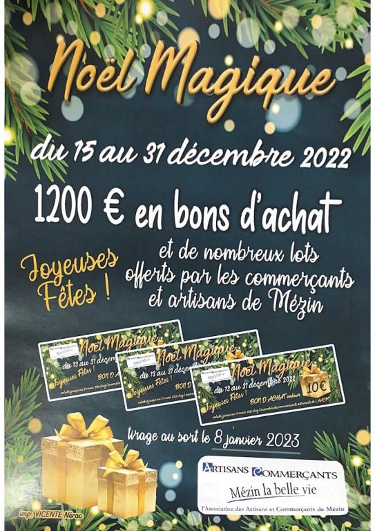 Du 15 au 31 décembre 2022, les artisans et commerçants de Mézin vous offrent 1 200 € en bons d’achat.