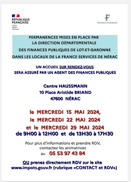 - Nérac : mercredis 15/05 - 22/05 et 29/05 2024 sur RDV9h à 12h et 13h30 à 17h30 - centre Haussmann (local Action sociale - France services)