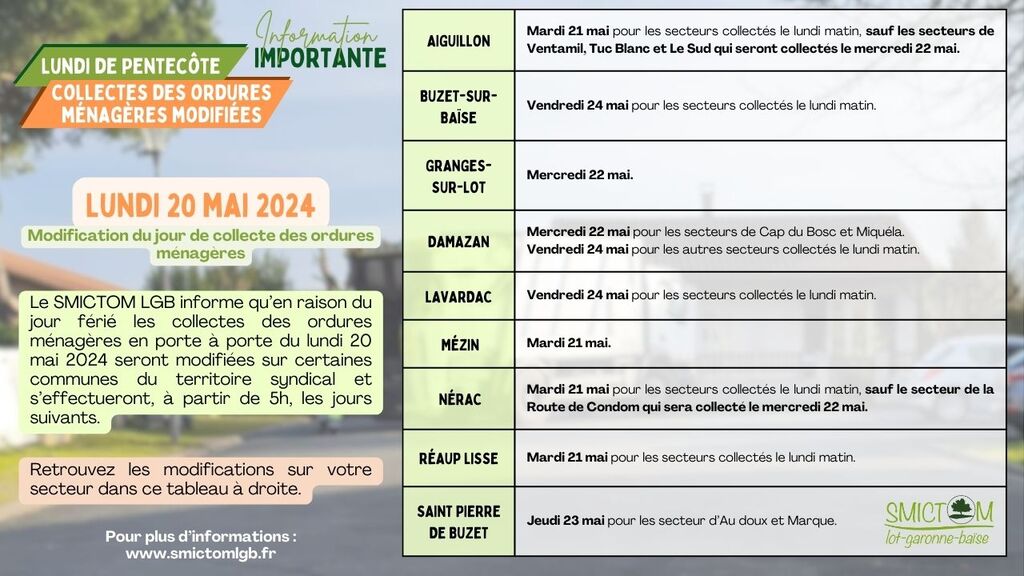 𝐄𝐧 𝐫𝐚𝐢𝐬𝐨𝐧 𝐝𝐮 lundi de pentecôte, 𝐥𝐞𝐬 𝐜𝐨𝐥𝐥𝐞𝐜𝐭𝐞𝐬 𝐝𝐞𝐬 𝐨𝐫𝐝𝐮𝐫𝐞𝐬 𝐦𝐞́𝐧𝐚𝐠𝐞̀𝐫𝐞𝐬 𝐞𝐧 𝐩𝐨𝐫𝐭𝐞 𝐚̀ 𝐩𝐨𝐫𝐭𝐞 𝐝𝐮 𝐥𝐮𝐧𝐝𝐢 20 mai 𝐬𝐞𝐫𝐨𝐧𝐭 𝐦𝐨𝐝𝐢𝐟𝐢𝐞́𝐞𝐬 𝐬𝐮𝐫 𝐜𝐞𝐫𝐭𝐚𝐢𝐧𝐞𝐬 𝐜𝐨𝐦𝐦𝐮𝐧𝐞𝐬 𝐝𝐮 𝐭𝐞𝐫𝐫𝐢𝐭𝐨𝐢𝐫𝐞 𝐬𝐲𝐧𝐝𝐢𝐜𝐚𝐥.