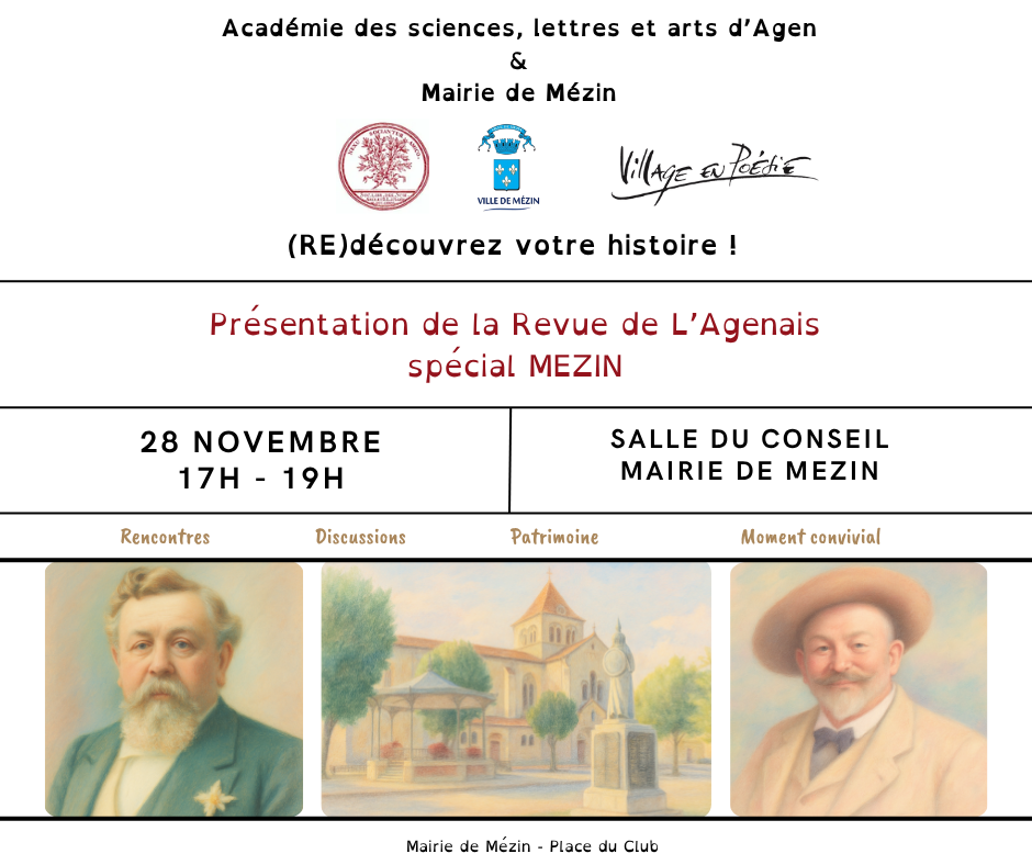 À l'occasion de la sortie du nouveau numéro de la Revue de l’Agenais (spécial Mézin), la Mairie et l'Académie des Sciences, Lettres et Arts d’Agen vous invitent à un moment d'échanges et de partages pour (re)découvrir l'histoire du village.