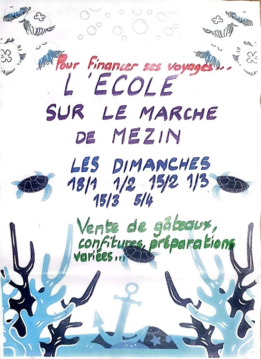 Afin de pouvoir financer les 3 voyages prévus cette année à l'école élémentaire, dans la région bordelaise et en Méditerranée, les classes de CE1/CE2, CE2/CM1 et CM2 seront au marché afin de vous expliquer leurs projets et vous proposer de délicieux gâteaux, des confitures "maison", des gaufres fraîches et autres gourmandises...
